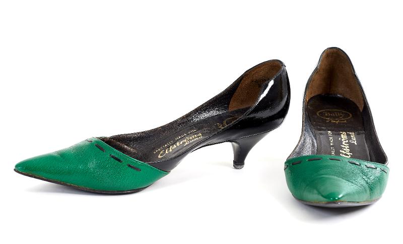 Svart och gröna. Bred läst men mycket spetsig fram. Tåhättan är grön, resten av skon svart. Skon är lågt ringad men har normalstor hälkappa. Guldtext innuti: Bally of England Specially made for Elfströms Lund. 5 cm hög, spetsig något indragen klack.