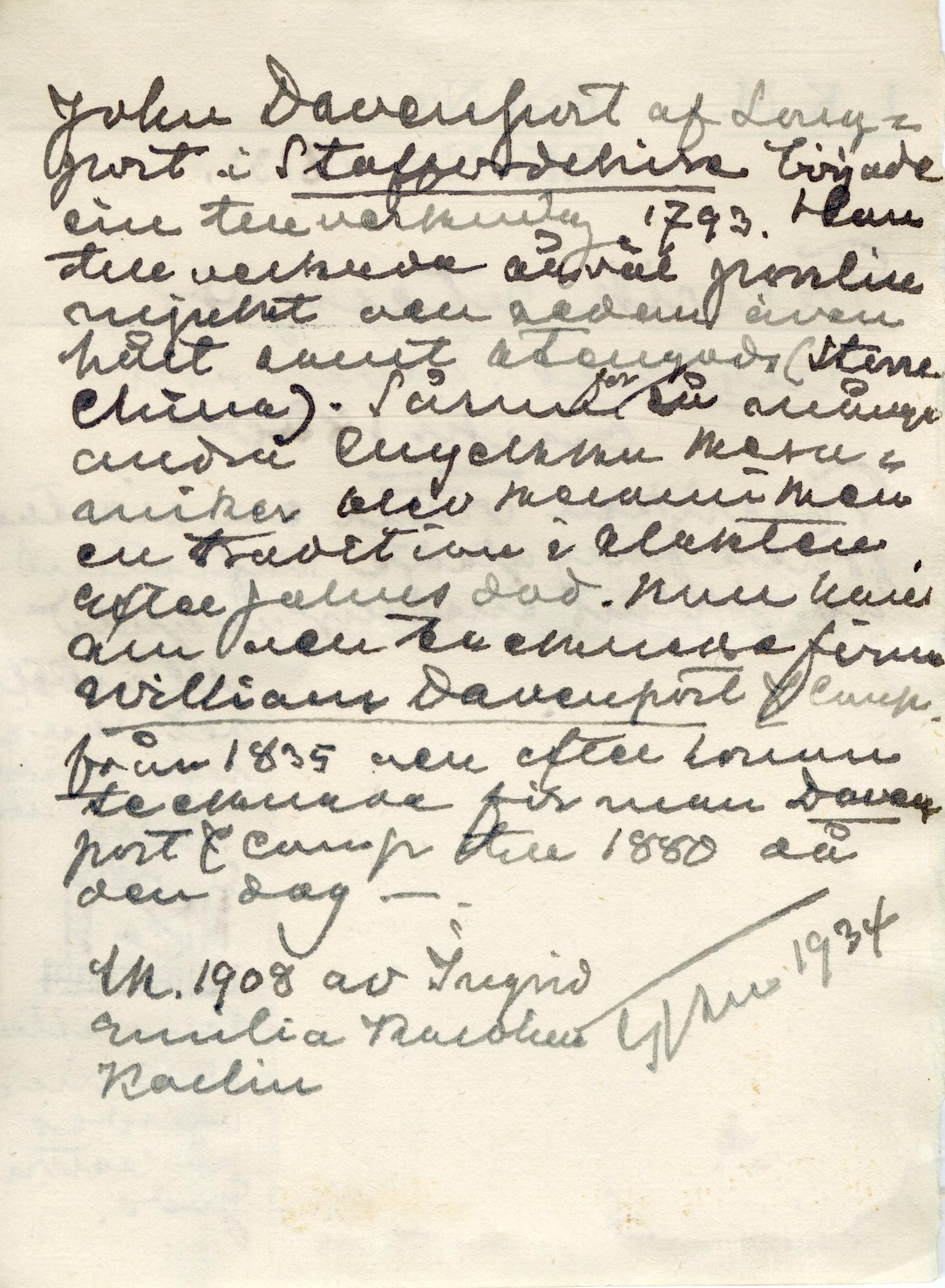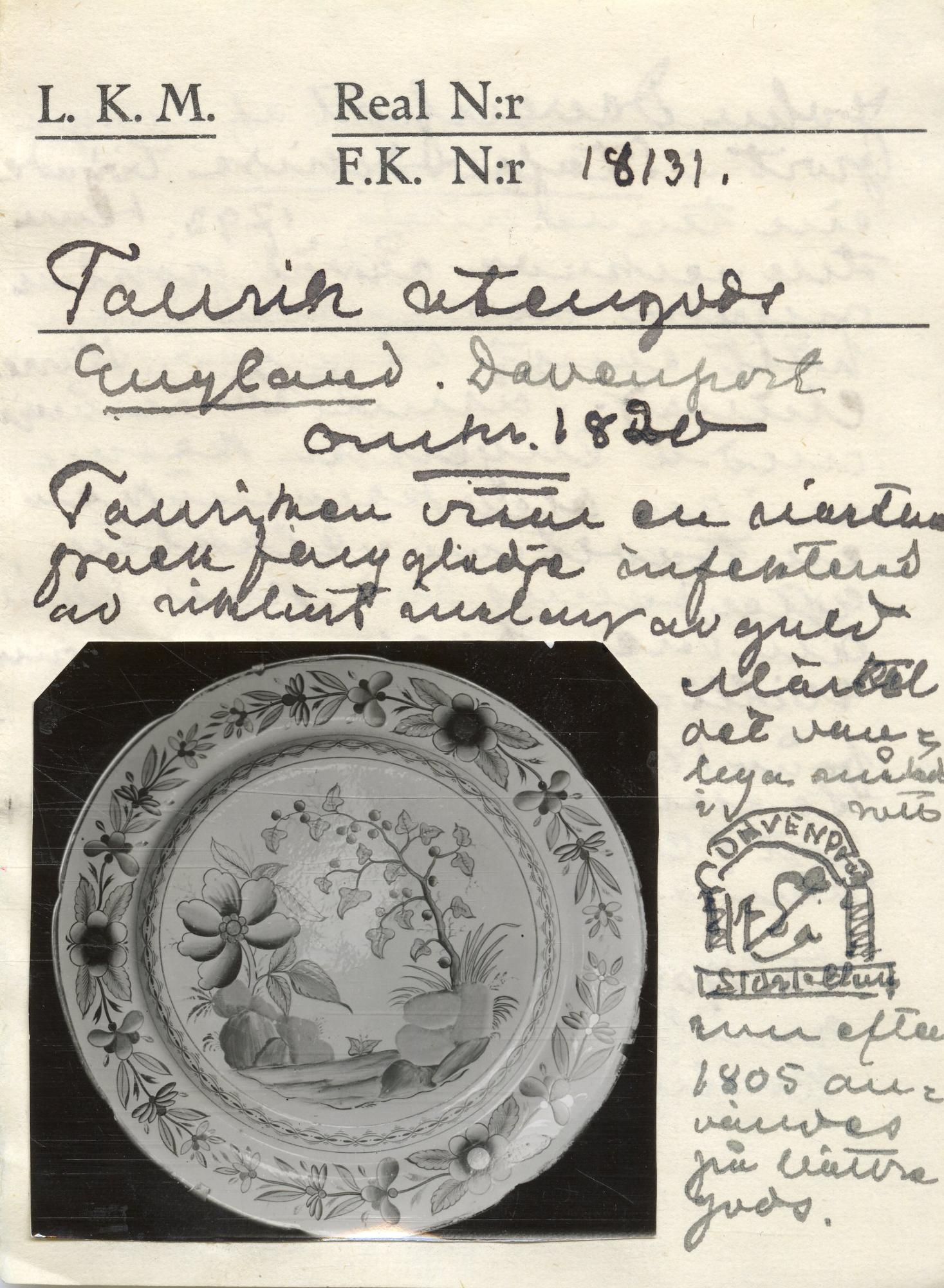 målat märke i rött: DAVENPORT ankarstämpel STON POTTERY [?] [avritat på katalogkort], (vilket enligt katatligkort användes på bättre gods efter 1805)