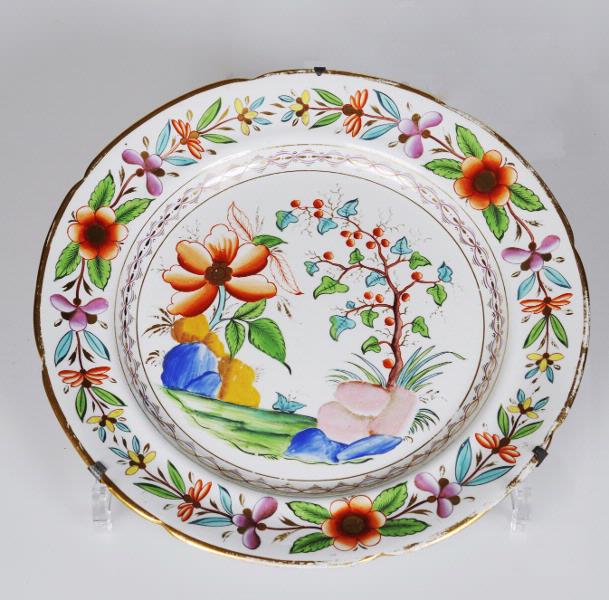 Både bräm och spegel med polykromt målad blyglaserad dekor med inslag av guld, blommor och växter.
