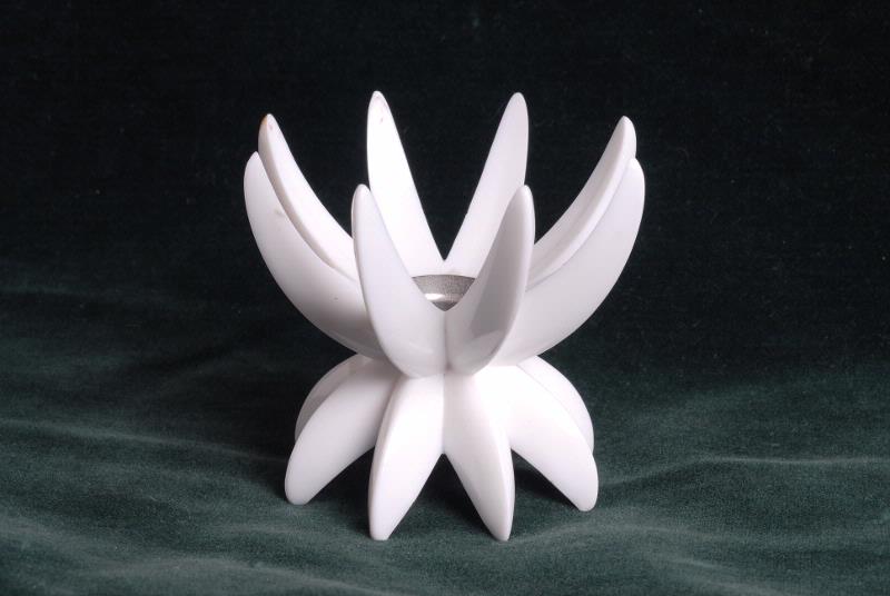 Vit, med fot av åtta nedåtgående armar och hållare omgiven av åtta uppåtgående armar. Använd i givarens hem i Åkarp med rött julgransljus.