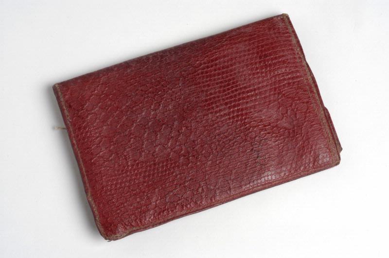 Plånbok, röd, skinn, pressat ormskinnsmönster, längd 14,5 bredd 10 cm. Innehöll ursprungligen 2 torkade edelweissblommor, en av dessa troligen KM 88995, den andra förkommen