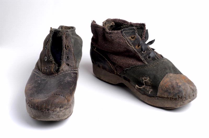 Kängor, skinn och ylletyg, träbottensulor, flera olika lagningar med isatt tyg mm, 26x12 cm.