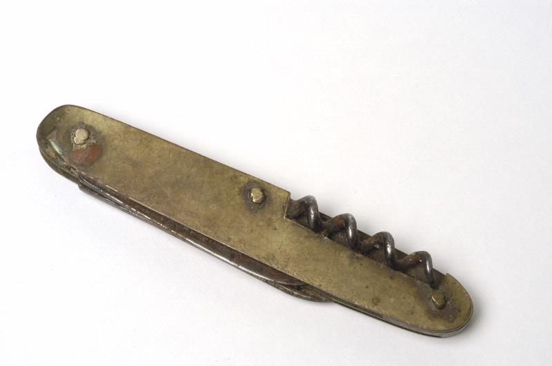 Fällkniv med korkskruv, längd ca 8 cm bredd 1,5 cm. Sliten, del saknas. Gulvit metall.