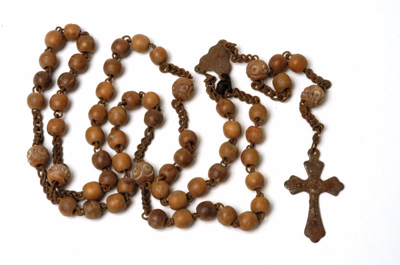 Radband med krucifix och trekantig platta. Kulor av ljusbruna bär eller frön. Hopsatt med små kedjebitar i metall. Krucifixet ca 2,5 cm.