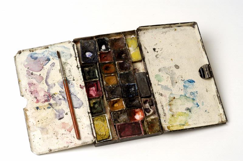 Akvarellåda av traditionell typ i plåt, hopfällbar, ca 12 cm lång och 7,5 cm i hopfällt skick. Innehåller rektangulära akvarellfärger som köps lösa. Väl använd. Pensel med brunt skaft.