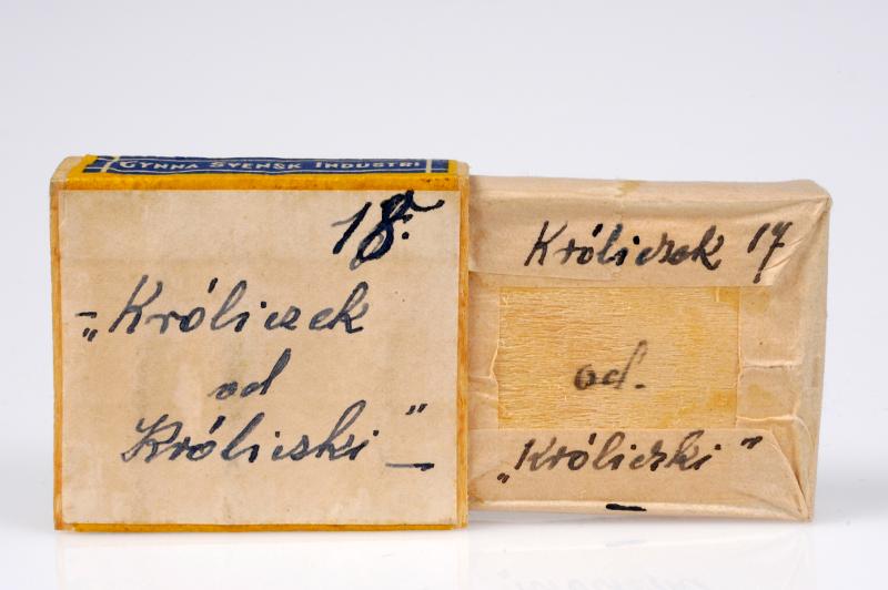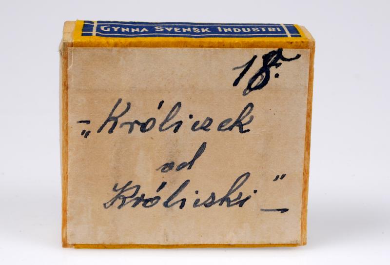 Ask för diamant häftstift. Använd i museet för förvaring av föremål från Ravensbrück. Påklistrad lapp med bläcktext på polska och numret 18.