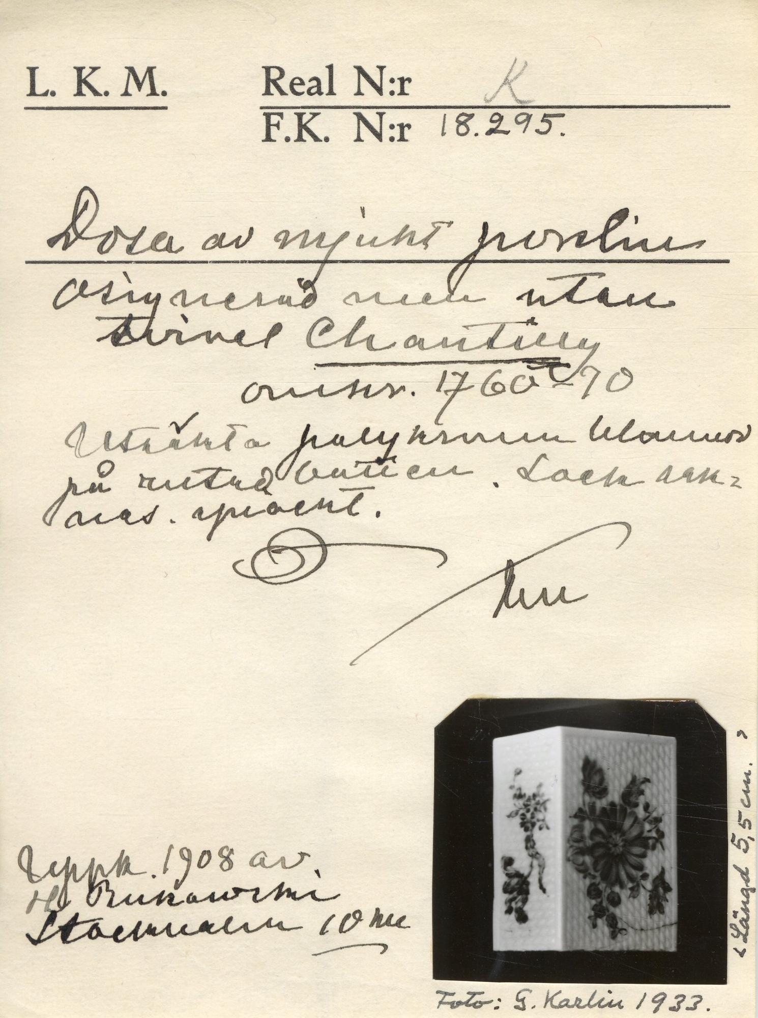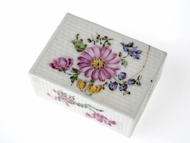 Mjukt porslin. Rektangulär med polykrom blomsterdekor på reliefrutad botten. Sprucken.