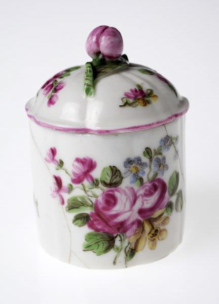 Mjukt porslin. Cylindrisk med kupigt lock med knopp. Blomsterdekor i rosa, grönt, gult och blått.
