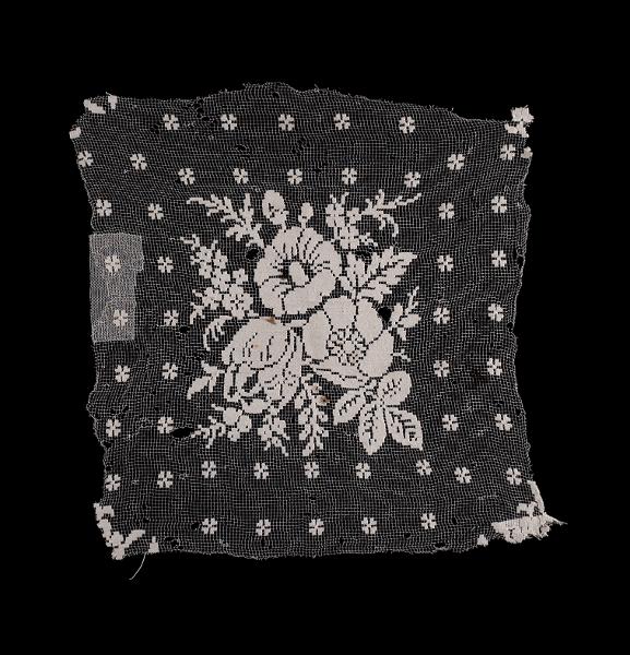 Vit. Fragment. Botten i lingarn, mönstret i bomullsgarn. I mitten en blombukett. Över resten av ytan jämnt fördelade fyrklöver.