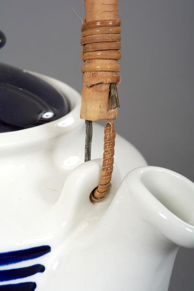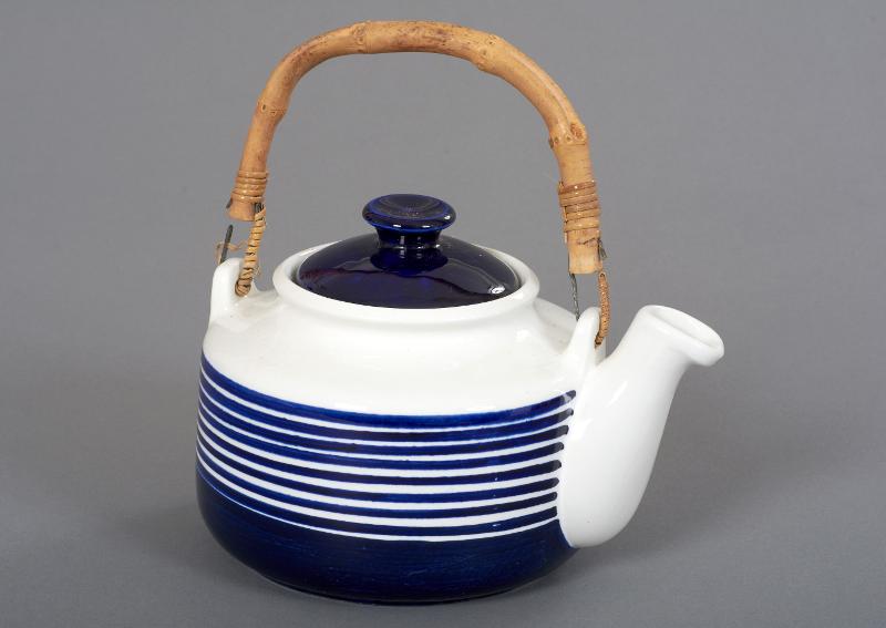 Målad dekor i koboltblått med bred rand och smalare ränder, locket helt blått, handtag av bambu.
