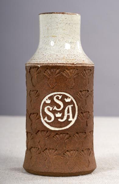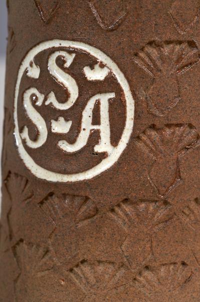 Rund med vit tennglasyr på övre delen, småhål upptill för ströandet, inpressad stämpeldekor med text: SSA.