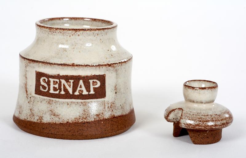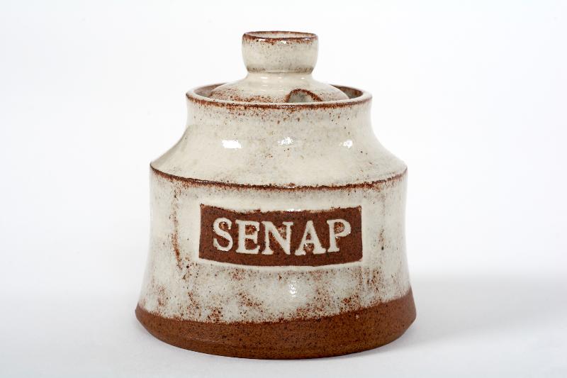 Rund med keramiklock, uttag för sked i locket. Vit tennglasyr, i glasyren är ett textfält utsparat med inpressad text: SENAP.