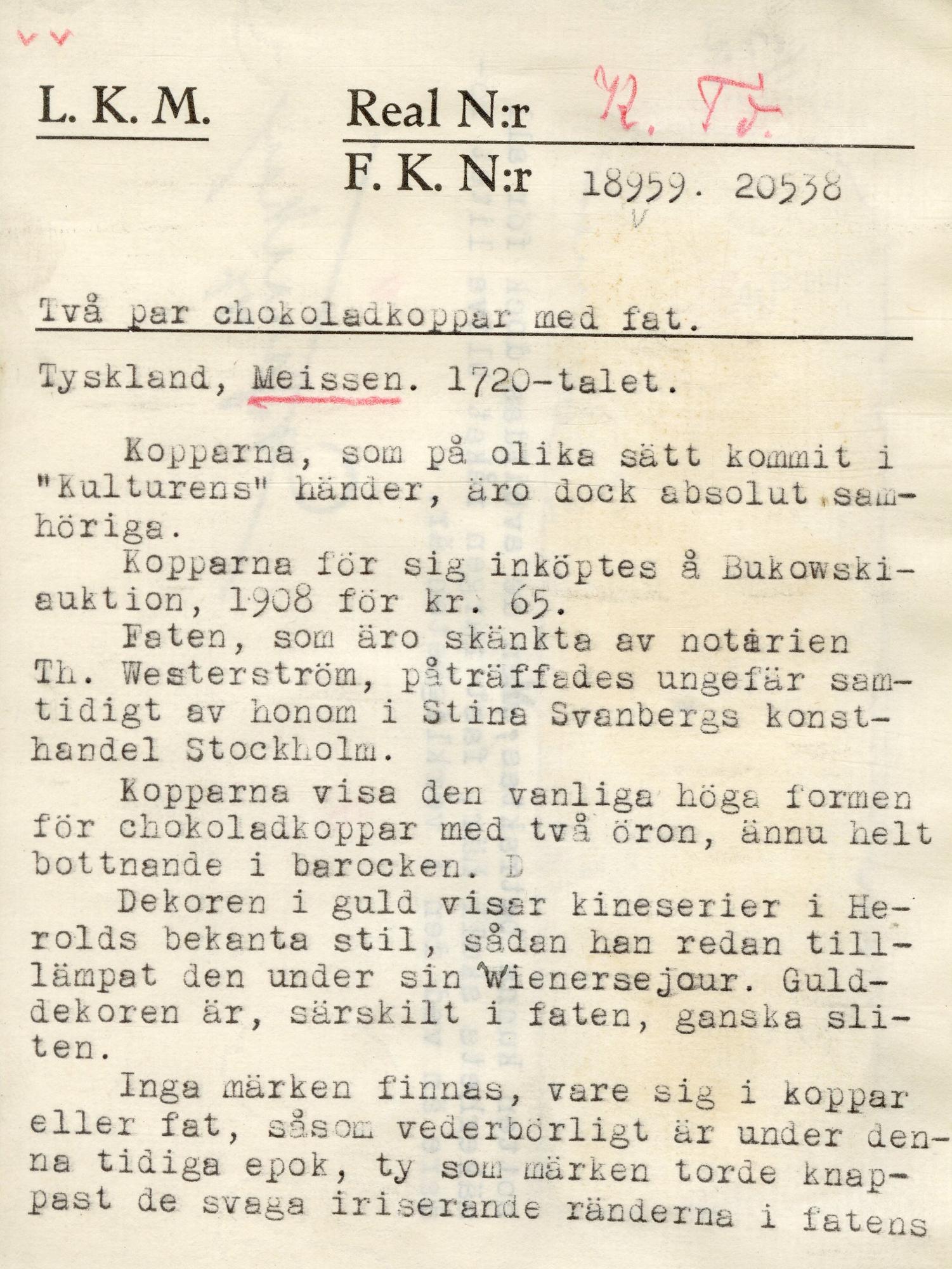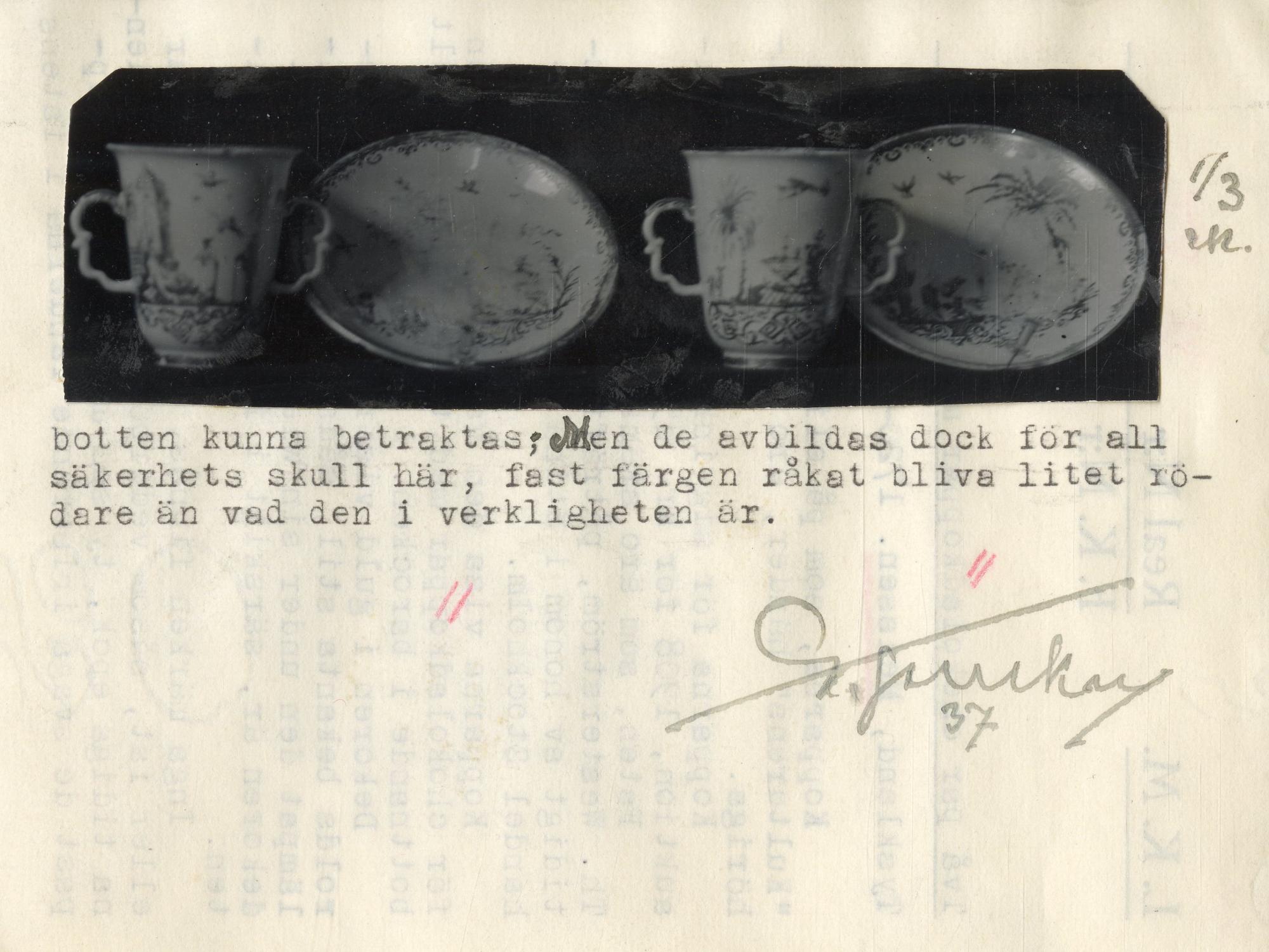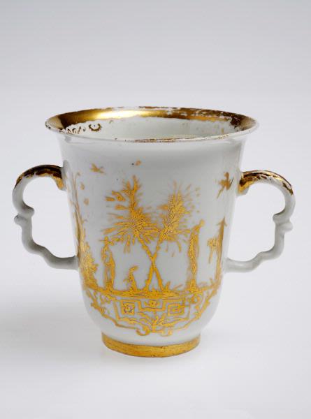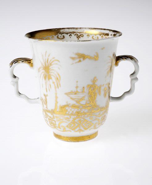 Chokladkopp, låg fotring, utvikt mynningskant, dubbla lodgrepar. Vit med guldkineserier. Böttgerporslin.