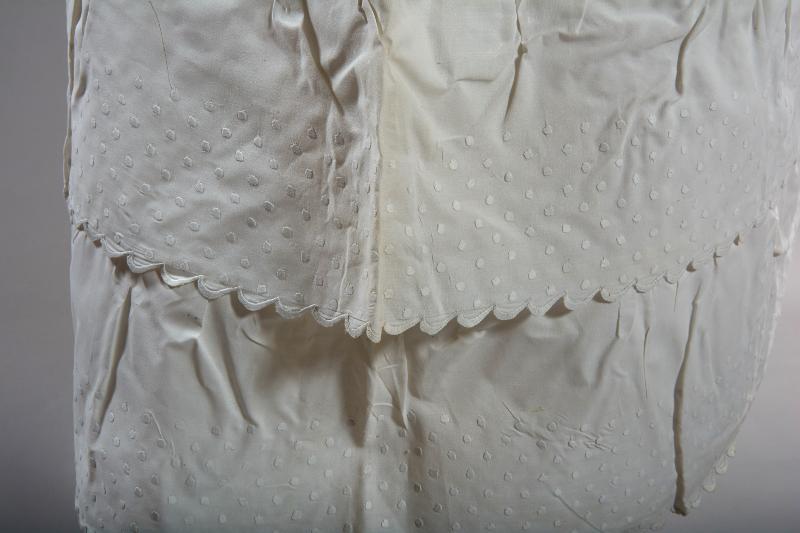Vit. Rundad nederkant 2 rader rynkade volanger 15 cm breda ovanför fållen. Maskinbroderade prickar och udd. Rynkat vid midjelinning som knyts med band. Ovanför volangerna en remsa med dragsko för ytterliggare rynkning.