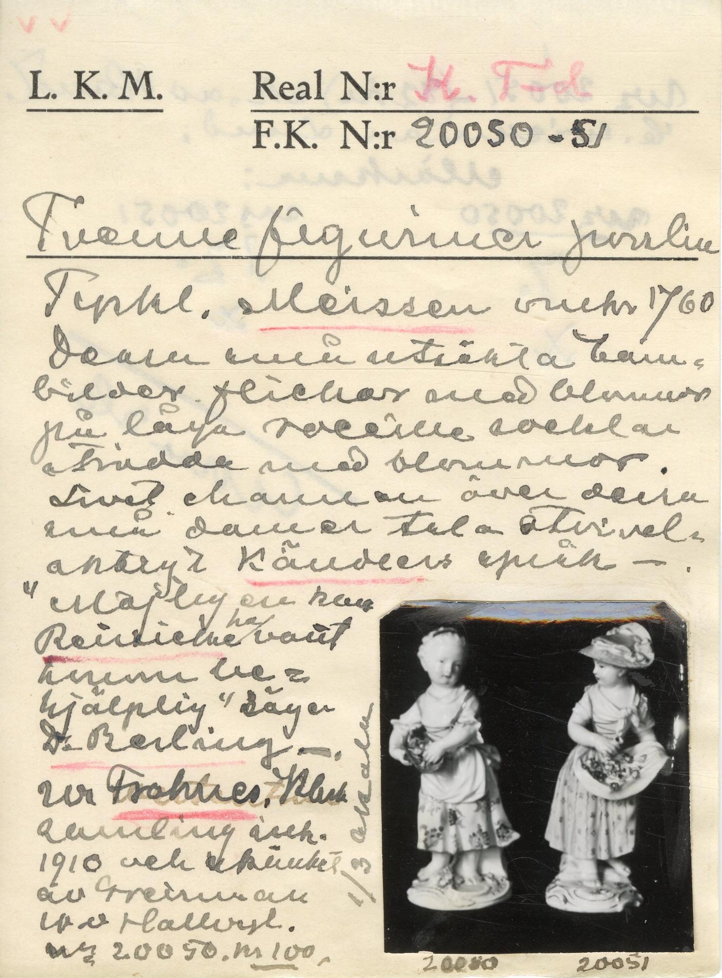 Enligt Berling skulle Peter Reinecke varit Kändler behjälplig med modellen, vilket förefaller sannolikt. Jämför med KM 20051[pendang].; Köpet bekostat av grevinnan Wilhelmina von Hallwyl.