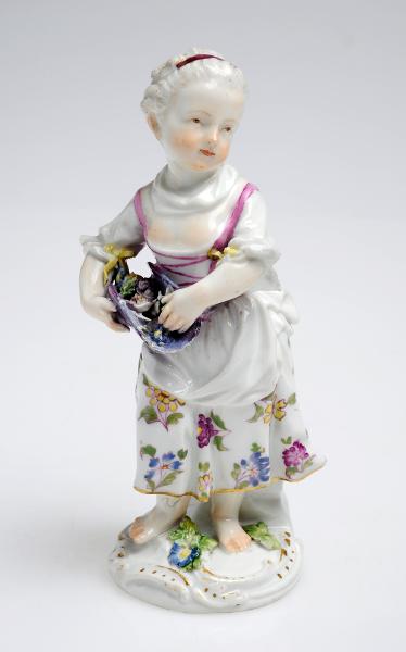 Flicka med blommor. Klädd i blommig kjol, förkläde, skjorta, livstycke och med band i håret. Polykrom. Dekor i violett och grönt. Rund fotplatta med rocallier.