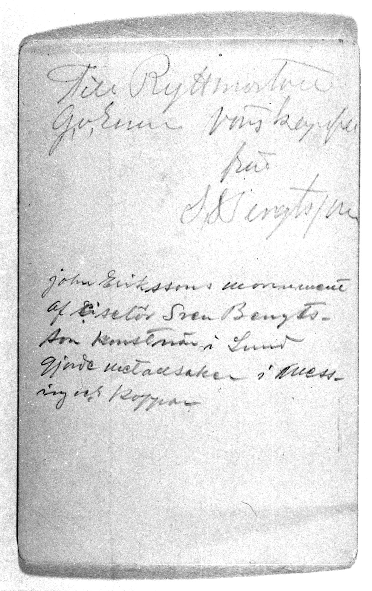 - "Till Ryttmästaren [oläsligt] Vänskapsbref från S. Bengtsson. John Erikssons monument af siselör Sven Bengtsson, konstnär i Lund, gjorde metallsaker i messing och koppar".