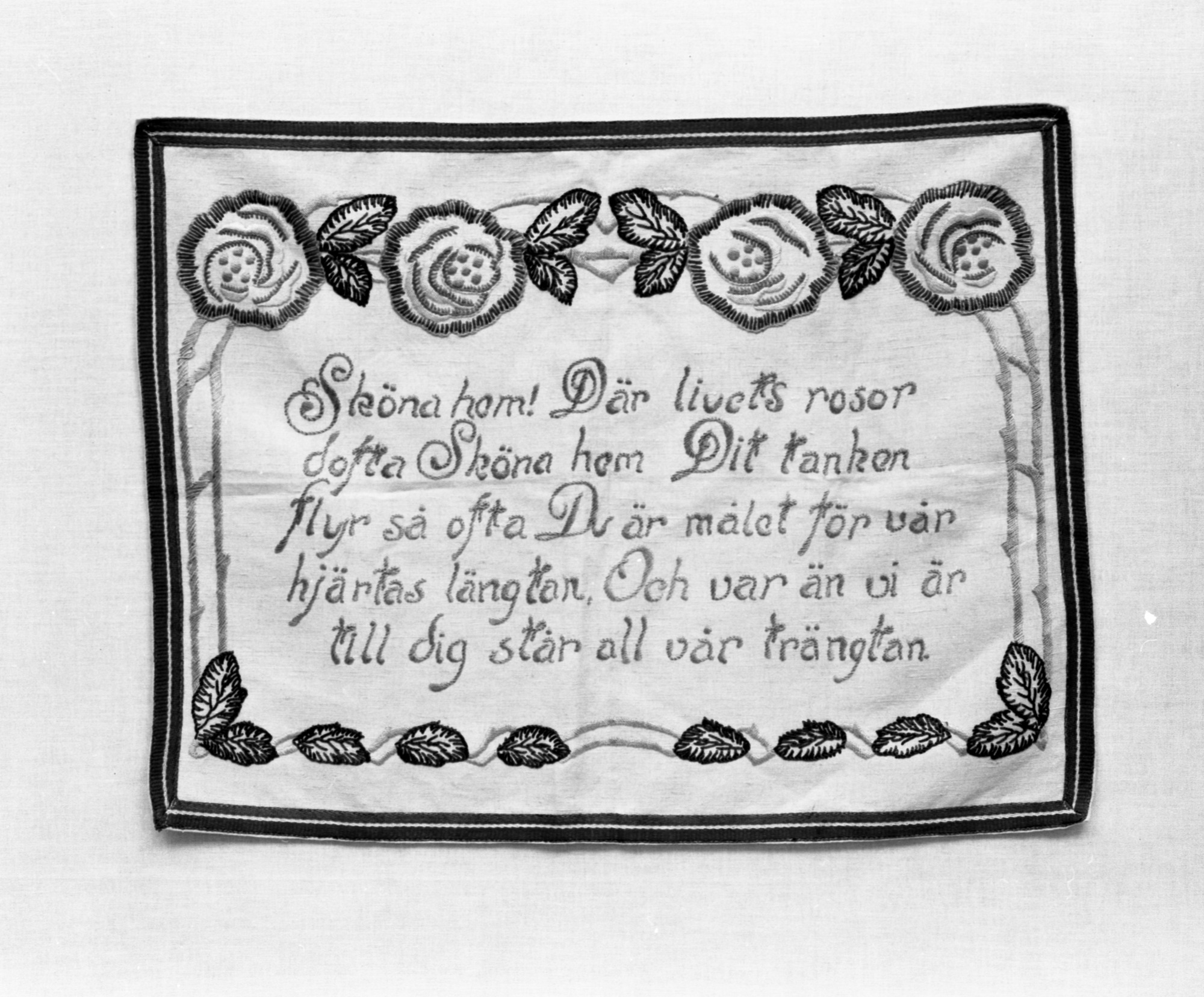- "Sköna hem! Där livets rosor doftar Sköna hem Dit tanken flyr så ofta Du är målet för vår hjärtas längtan, Och var än vi är till dig står all vår trängtan"