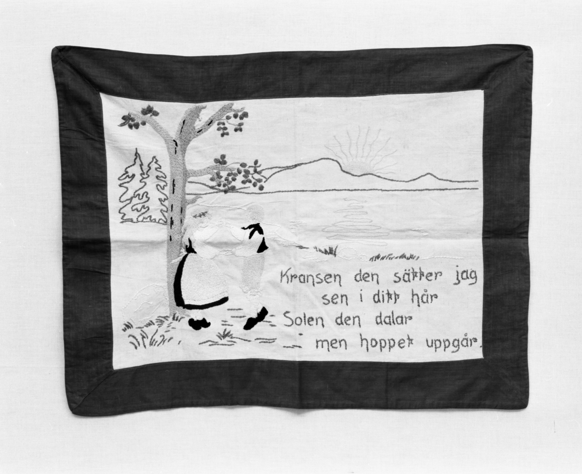 "Kransen den sätter jag sen i ditt hår, solen den dalar men hoppet uppgår"; Inlånade bonader för utst. Broderande Bonader Maj 1976.