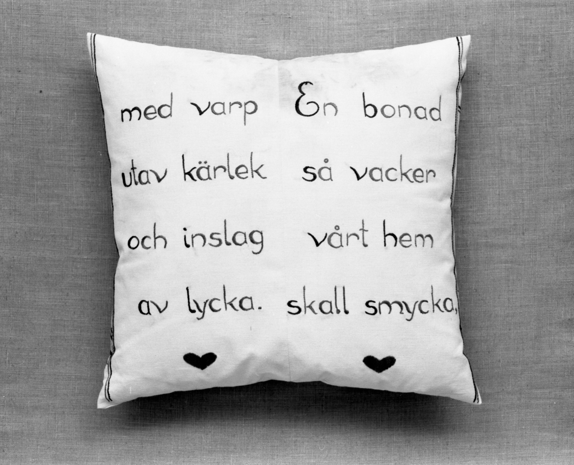 "Med varp utav kärlek och inslag av lycka, en bonad så vacker vårt hem skall smycka"
