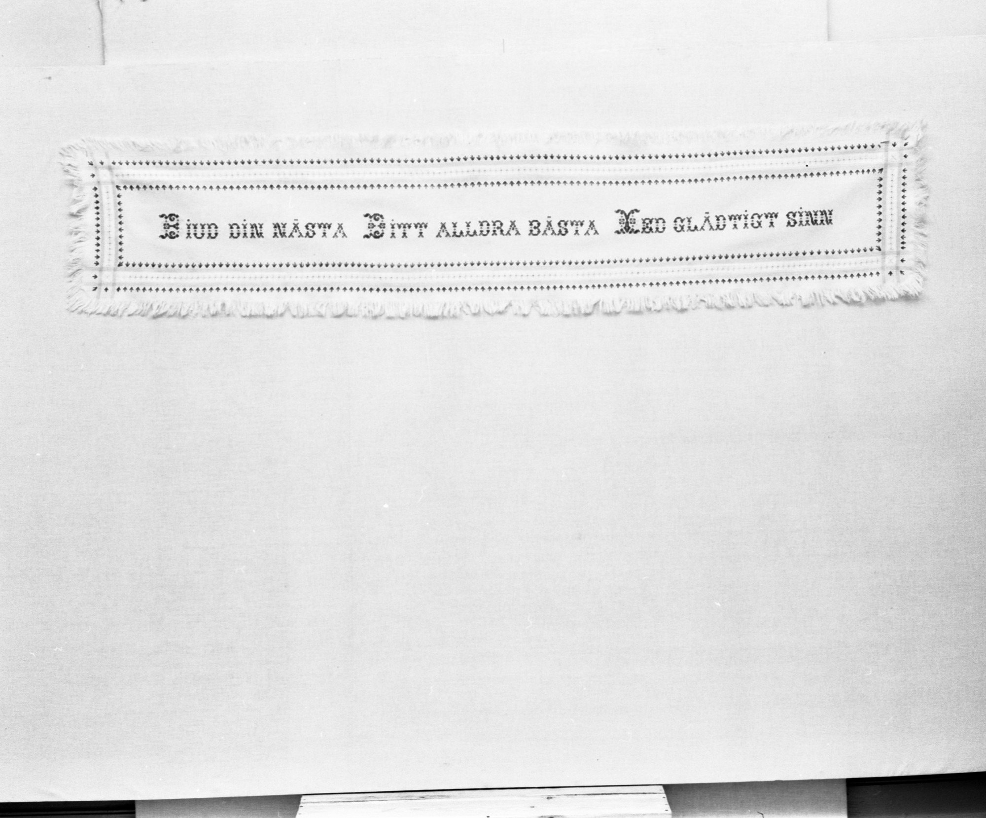 Inlånade bonader för utst. Broderande Bonader Maj 1976.; "Biud din nästa Ditt allra bästa Med glättigt sinn"