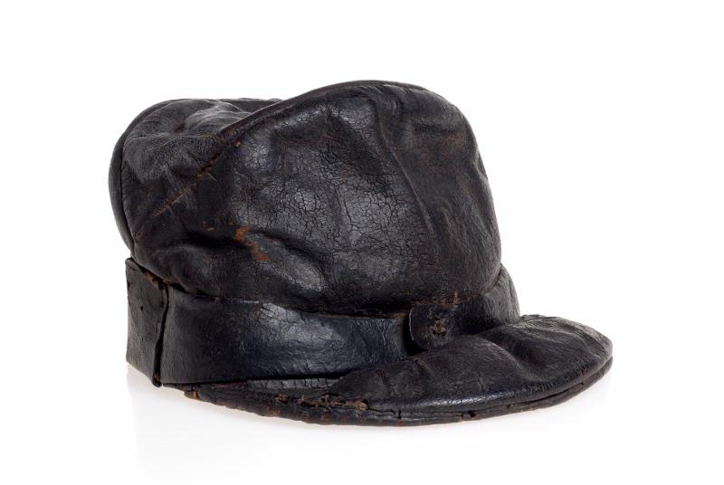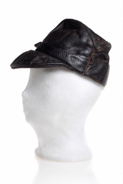 Svart läder. Sydd av 7 mönsterdelar med mjuk skärm. 2 läderremmar möts mitt fram på kullen. Vid insidan 7 fastsydda läderhyskor i vilka ett snöre är genomträtt, att användas för att reglera storleken.