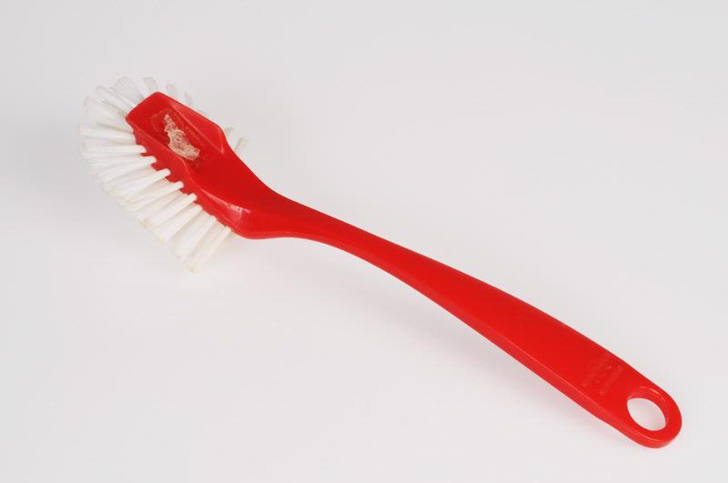 Skaftet rundat och breddat mot handen. Avslutas med rak kant vid borsten för att skrapa med. Röd med vit borst, hål i skaftet för upphängning. Stämplad med en krona och DIskborsten Borstkungen.