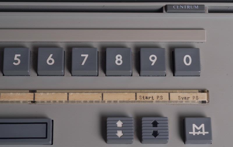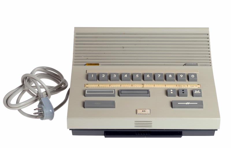 Ljusgrå, rektangulär med konkav ovansida med högtalare och kvadratiska, mörkgrå knappar. Grå sladd.
