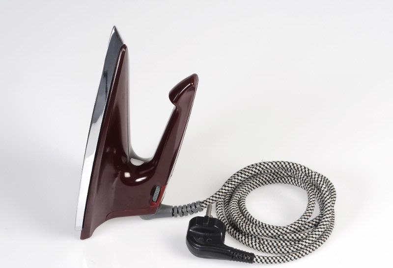 Stram, mycket tunn form, en lätt modell, med termostat. Täckt av vinröd plast i övrigt rostfritt stål. Grå detaljer, svart och vit textilsladd.