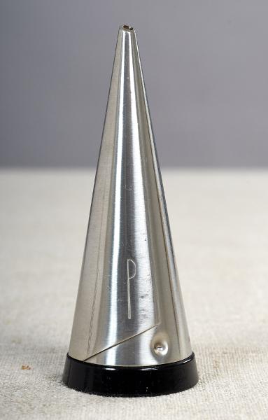 Rund, slät, konisk. I stål med ett litet hål längst upp i spetsen. Basen av svart, slät plast.