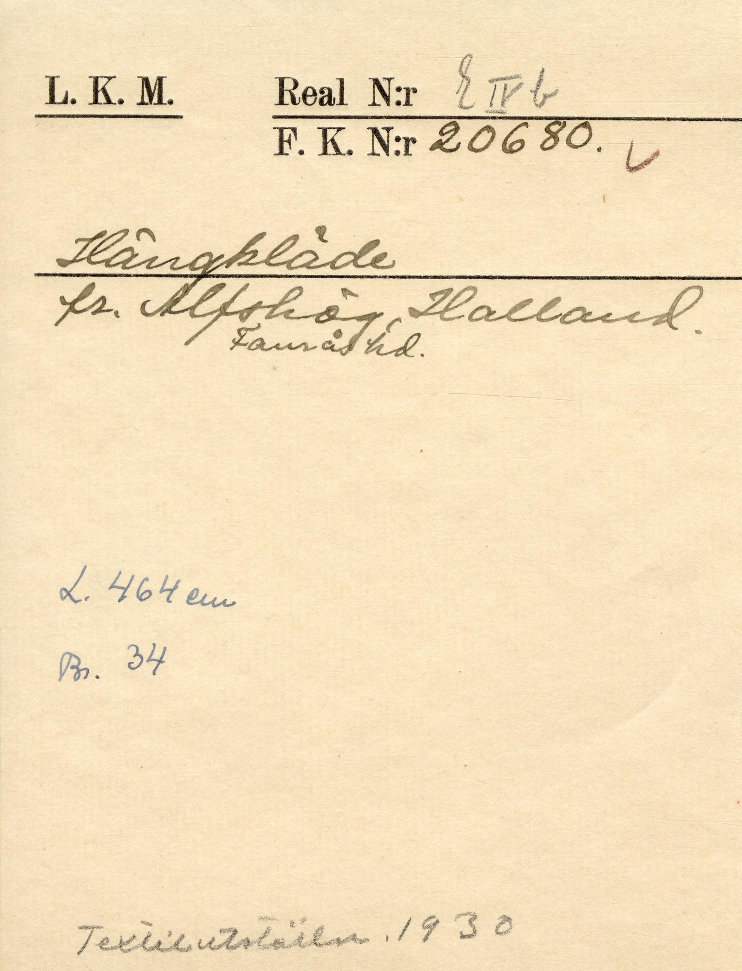 Vit botten. 9 bårder i blått lingarn och rött bomullsgarn. Varannan bestående av 2 blå, och varannan av 2 blå och en röd ca 6 cm breda ränder, omgivna av 2 smala röda ränder. 20-22 cm mellan bårderna. Extra 10 cm påsydda i ena kortsidan. Ofållad.