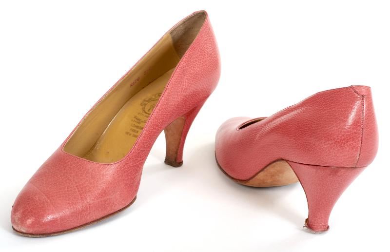 - Rosa skinn, något rundad tå, 7 cm hög klack, något insvängd, avsmalnande. Klacken av trä, klädd med samma rosa skinn. Lädersula. Fodrad med beige skinn med text i guld "Maglis Bologna Made in Italy EXPORT LONDON PARIS NEW YORK". Tillhörande skoblock i bok och metall.