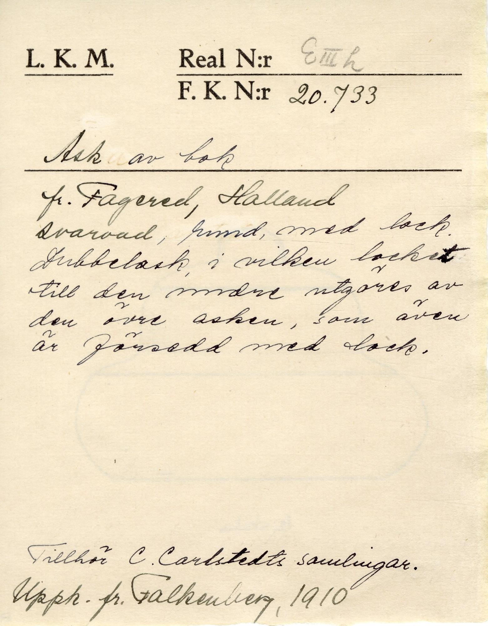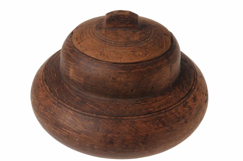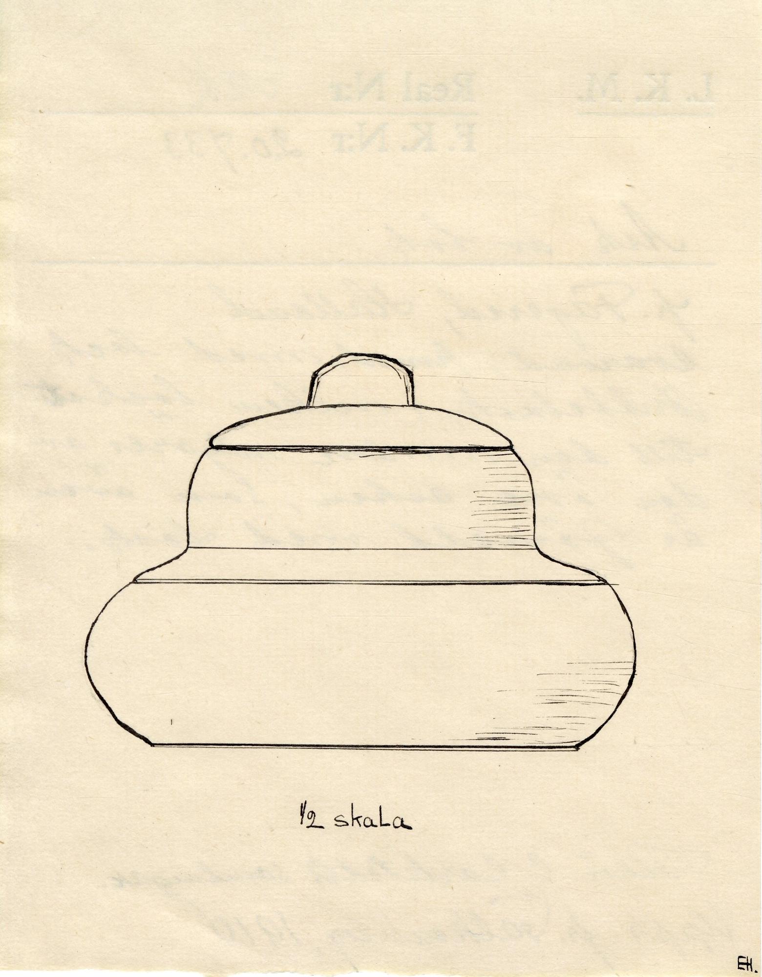 Rund, två plan, det undre bukigt, det övre med nästintill rak sida. Svagt välvt lock med rektangulär knopp.