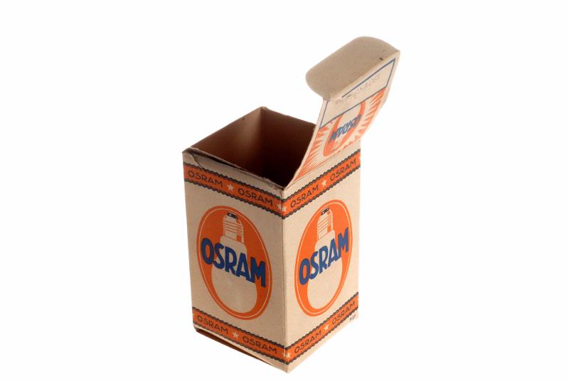 - Stående rektangulär förpackning. På samtliga sidor en siluett av lampan över en orange oval bakgrund med texten "OSRAM" skrivet i blått över. Två oranga bårder med texten "OSRAM" i löper ovan respektive under ovan nämnda figur. Locket något trasigt. På toppen av förpackningen anges typ/modellnamn för glödlampan: 130 V <3HLM. Innehåller tillhörande glödlampa KM 89832.
