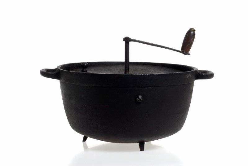 Gryta med rund botten. Med roterande spole som avslutas med ett handtag att veva med. På grytan finns siffran 3 ingjutet. Grytan har två öron.