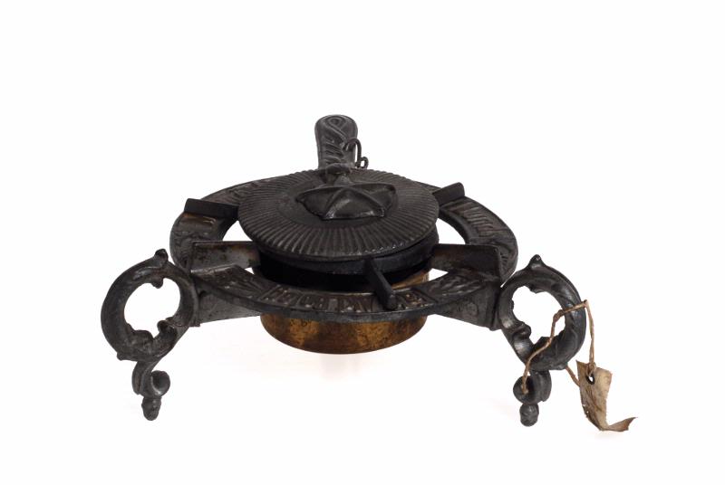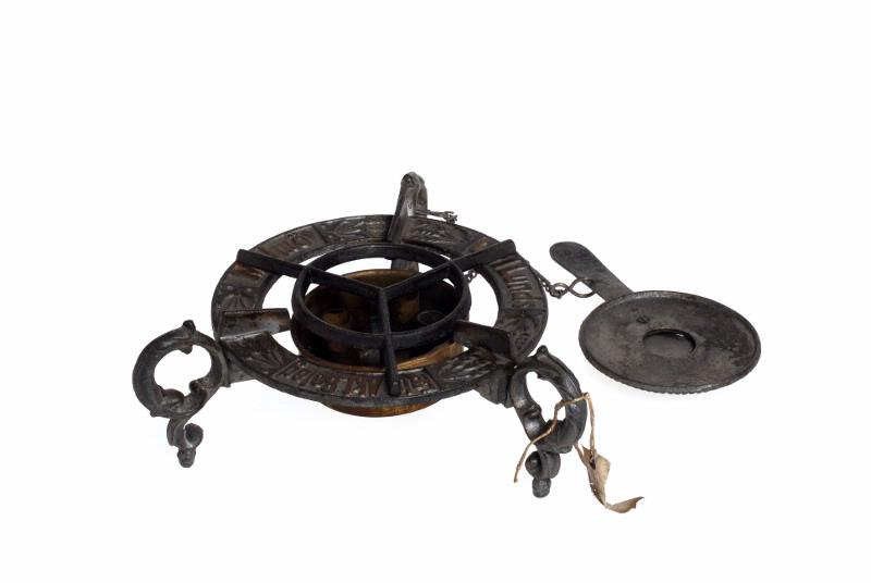 Av järn med lös behållare i gulmetall. Gjutet lock som sitter ihop med spritköket i en kedja. Spritköket står på tre ben. På dess ram står det: Carl Lunds Fabr.Akt.Bolag Malmö (inom en rektangel.