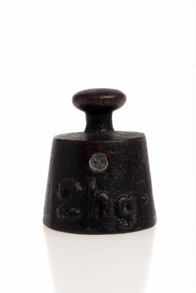 Rund, märkt "2 hg". Uppåt avsmalnande med rund platt knopp.