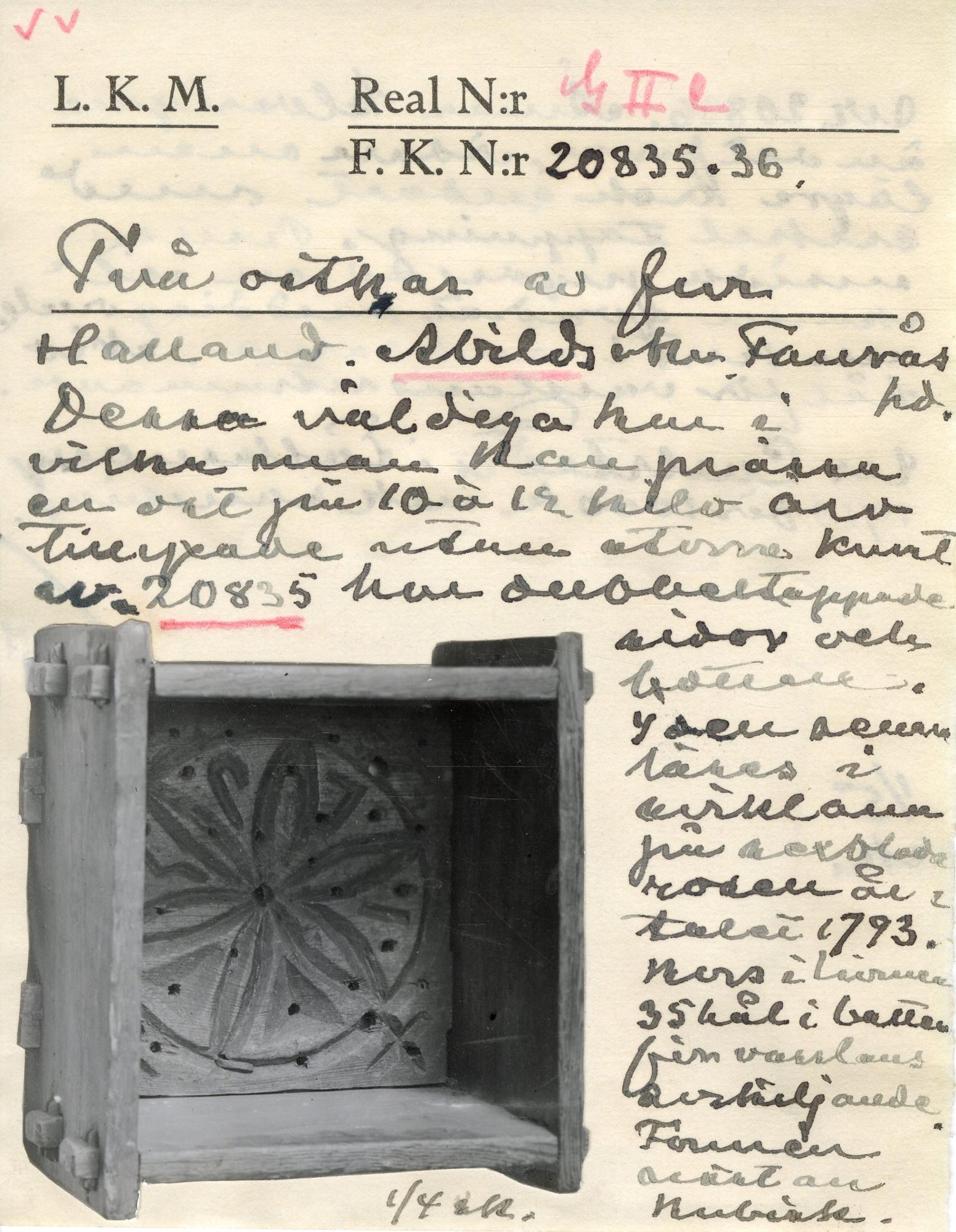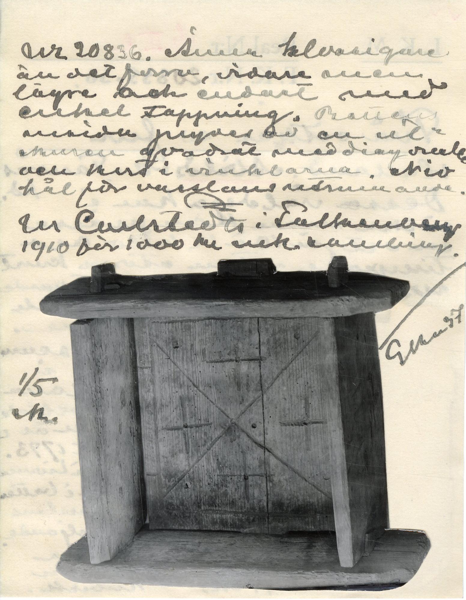 Kvadratisk, sexbladig blomma inskriven i cirkel. Gavlarna dubbltappade i långsidorna, tappningarna vågrätt dubbelreglade med träsprintar. Bottnen dubbeltappad i långsidorna, tappningarna lodrätt enkelreglade. I bottnen 33 avrinningshål. Inskription ILJE.
