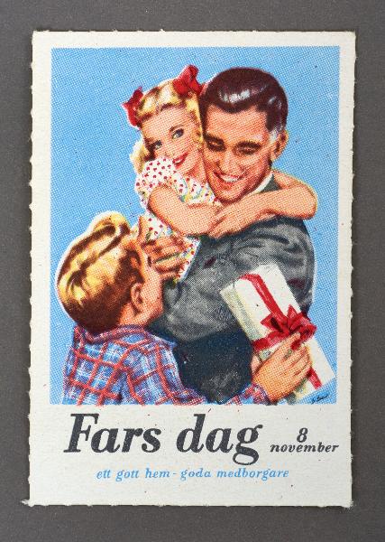 tryckt motiv av far och två barn och paket; text Fars dag 8 november ett gott hem - goda medborgare