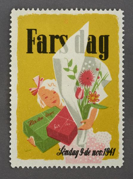 tryckt motiv av flicka med paket och blombukett; text Fars dag Söndag 9de nov 1941