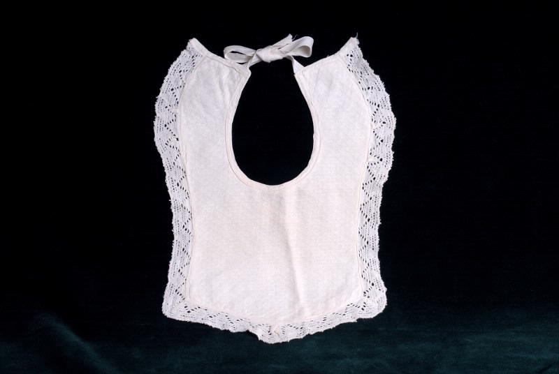 Vitt noppigt tyg, kantad med spets. Ej ursprungligen avsedd för en docka.