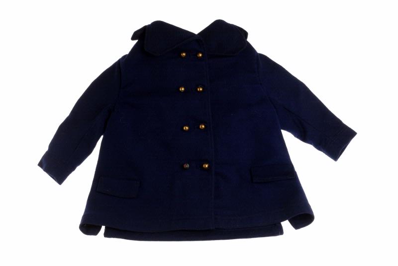 Kavajmodell. Mörkblå, dubbelknäppt med kulformiga mässingsknappar. Slag på fickorna och stickningar runt ärmarna.