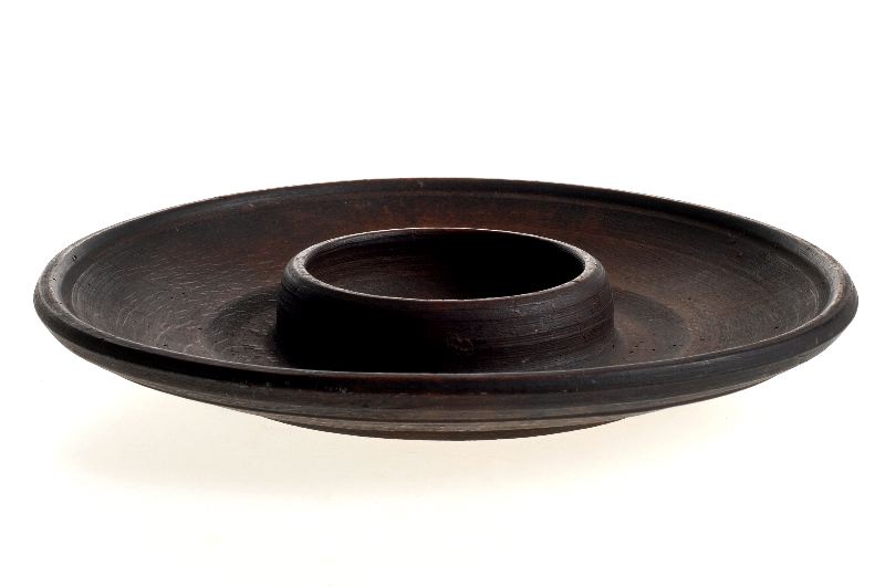 Djup i mitten. Brättet har starkt lutande kanter. Brun