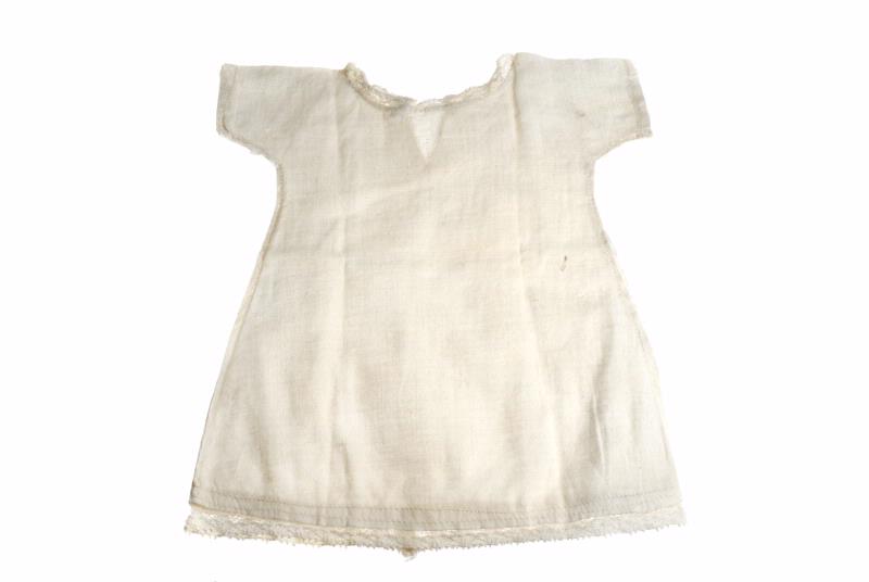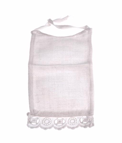 Vit, nederkanten kantad med brodyr. Smaka linneband att knyta.