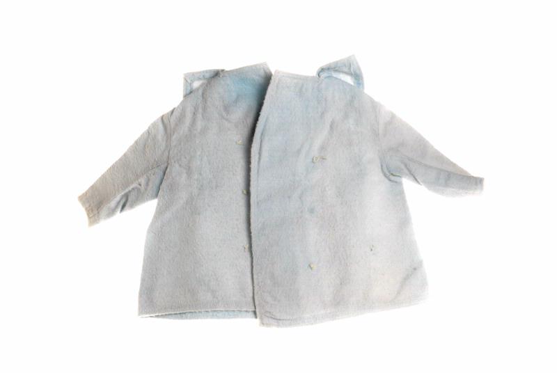 Ljusblå, dubbelknäppt, knapparna borta. Sjömanskrage av samma tyg.