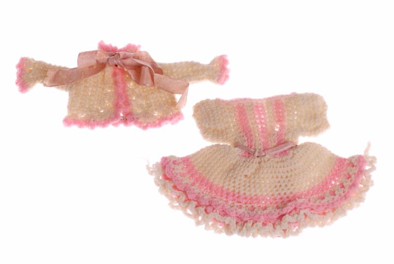 Bestående av klänning och jacka. Vitt och rosa ylle, stickat, kjolen vid och volangkantad. Tillhörande jacka i samma teknik och material, har sidenband i halsen.