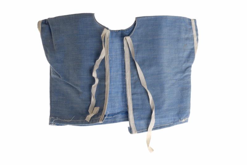 Blå-vit med holkärm. Vita bendelband längs framkanterna som knyts i halsen.