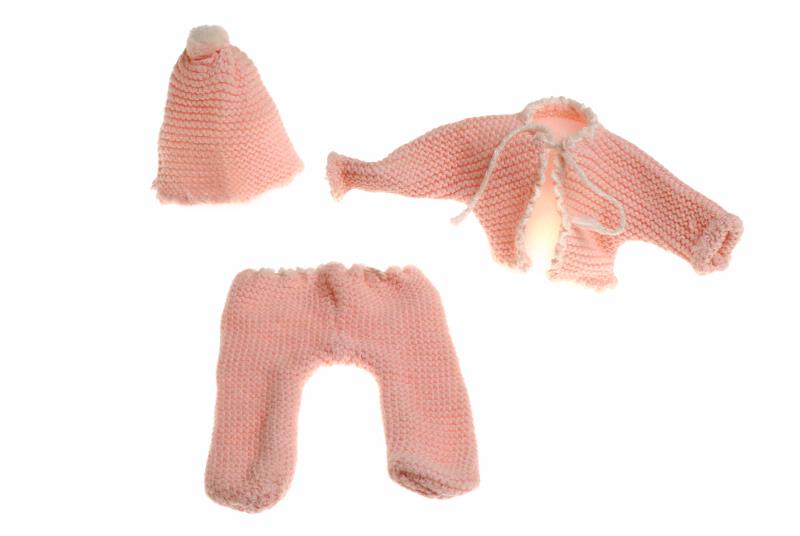 Sparkbyxa, kofta i mössa, spädbarnsplagg. Rosa, rätstickade. Vit linning på byxan, vita kanter, uddade på koftan och mössan med vita och rosa tofs.