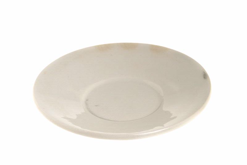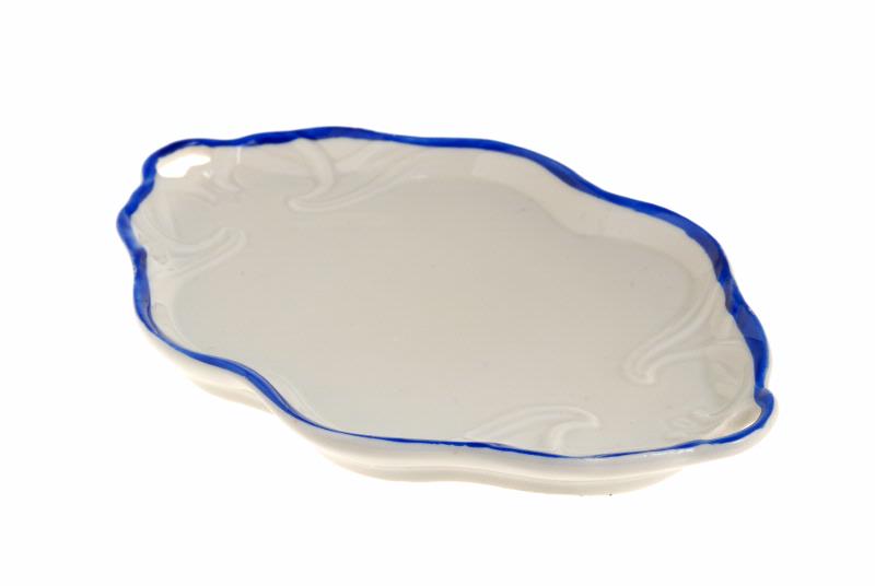 Katalogkort endast på 2 st fat: 1 st i vitt porslin, Gustafsberg. 1 st uppläggningsfat, vitt med reliefmönster och blå kantband.