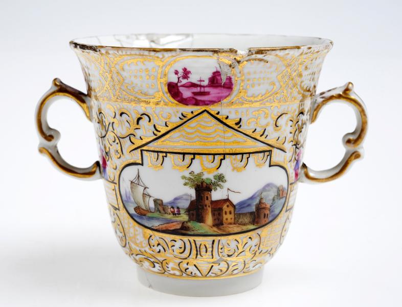 Två hänklar, rocailler och nätverk i guld, nästintill yttäckande dekor, vid mynningen kartuscher med landskapsmåleri i purpurcamaïeu, mittkartusch med polykromt landskapsmåleri. Fat saknas.